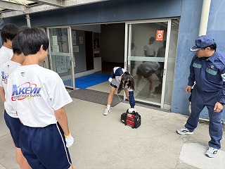 4日には明海中学校で体験が行われ、2年生(66人)が参加。4班に分かれ、発電機をかけて電灯をつけ、簡易組み立てトイレ腰掛式とワンタッチパーテーションを組み立てた。特にトイレは構造が複雑だったが、仕組みを逐一確認しながら取り組んだ。体験の指導役は、地震発生時に同地区の避難所に直行する市職員が担い、自らの行動の再確認としても生かした。