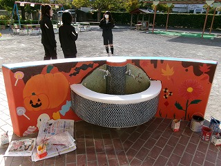 周囲をペンキで汚さないように注意を払いながらも、ジャージにはペンキが付き、同じ色を毎回作ることが大変で、筆洗いは寒さで手がかじかむなど苦労もあったが、部長の二ノ宮香乃さん、副部長の賴末菜央さんと濱田梨央さんは「個人制作が多いので、何もなかったところに私たちの、それもみんなで協力してカラフルなアートを描けてやりがいがあった。園児たちが喜んでくれたらうれしい」と話した。