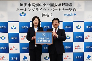 浦安市高洲中央公園にある少年野球場のネーミングライツ・パートナーに、wash―plus(浦安市猫実1、高梨健太郎社長)が決まり、同球場の名称は1月1日から「wash+少年野球場」となった。