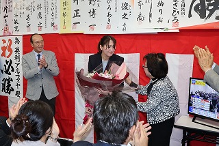 政治とカネの問題、石破首相の不人気で保守層が離れた前回選挙から、1年3カ月余り。2位を大きく引き離しての小選挙区勝利に、花束贈呈、万歳三唱、当選報告会…と、事務所は喜びに包まれ、報道陣のインタビュー後には、4月に市長選を控える田中市長が、事務所入りした。